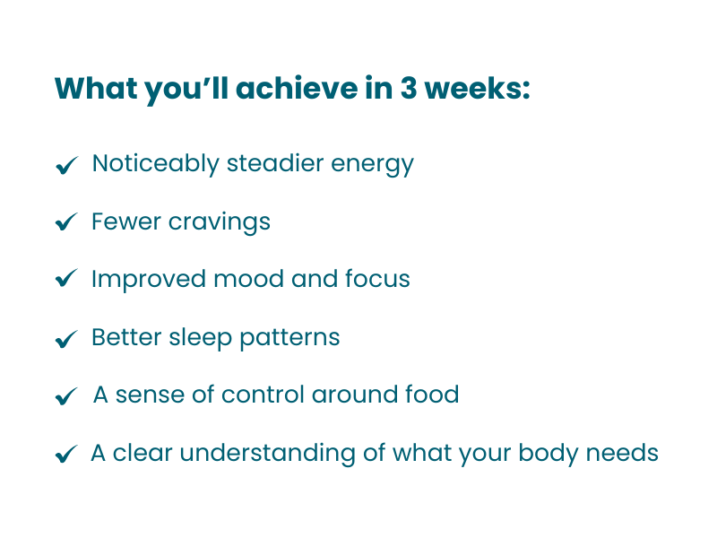 You’ll learn the core principles of eating for metabolic stability, building healthier rhythms, and resetting the habits that influence hunger, energy, and emotional eating.